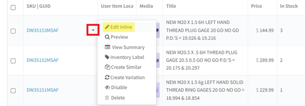 i. Click the triangle that appears when you hover over the SKU, then select "Edit Inline":