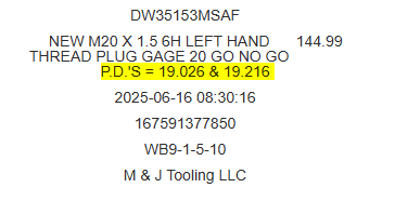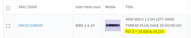 iii. P.D.'s should always be listed with the Go P.D. first and the No Go P.D. second. Be sure to include the full class (including things like STI, L1, 6-Step, etc.) as well as any specialties such as Left Hand. For example: 1 3/8 - 18 UNEF 2B Left Hand Thread Plug Gage P.D.'s: 1.3389 & 1.3452. Contact Josh or Matthew if you have questions about proper formatting.