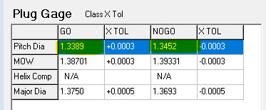 7. Select the corresponding tab for the type of gage you need (Ring Gage, Set Plug, or Plug Gage). You will find the Go and No Go P.D.'s listed at the top of the table: