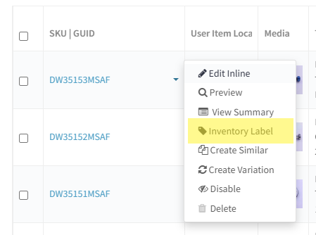 iii. Click the triangle again and this time select "Inventory Label":