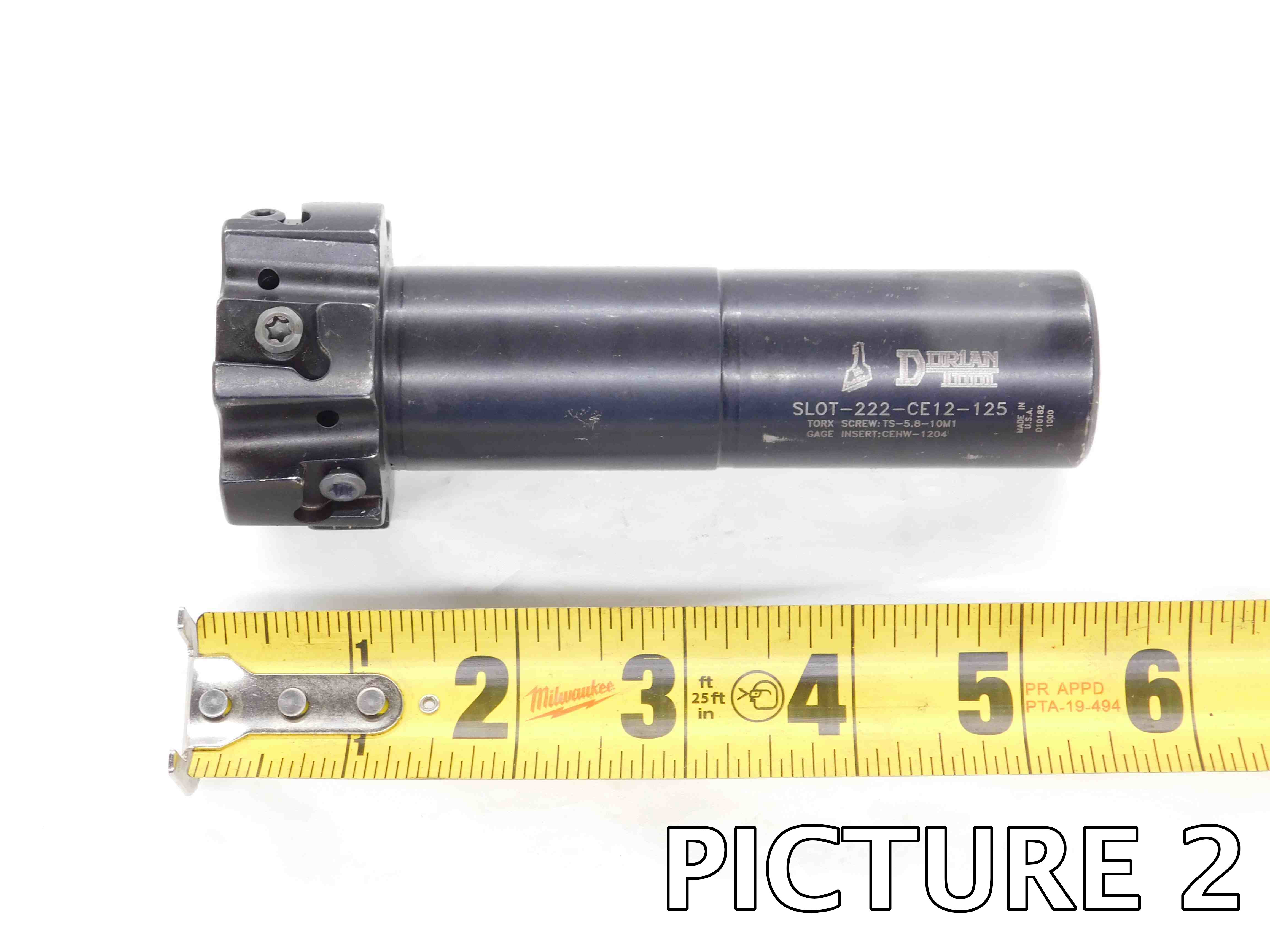 2nd Picture: A side view of the cutter, with a tape measure at the bottom of the frame to provide size reference. If there is labeling on the shank, it should be visible if possible and readable (i.e., right-side up).